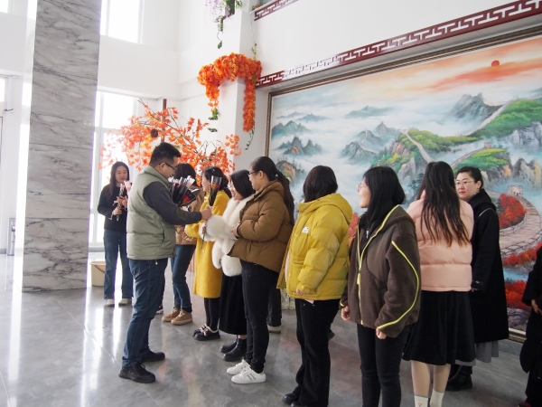 山东金年会控股集团党支部书记刘子豪代表党支部与工会为集团女神们送去节日祝福与暖心礼物,并祝福各位女神们,做一朵自由生长的花,勇敢而细腻,温柔又有力!